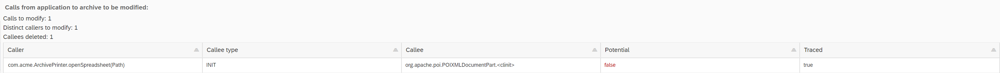 | Traced | Indicates whether the respective construct has been executed during JUnit or integration tests Click on the icon in order to see the actual call graph leading to the respective vulnerable code |