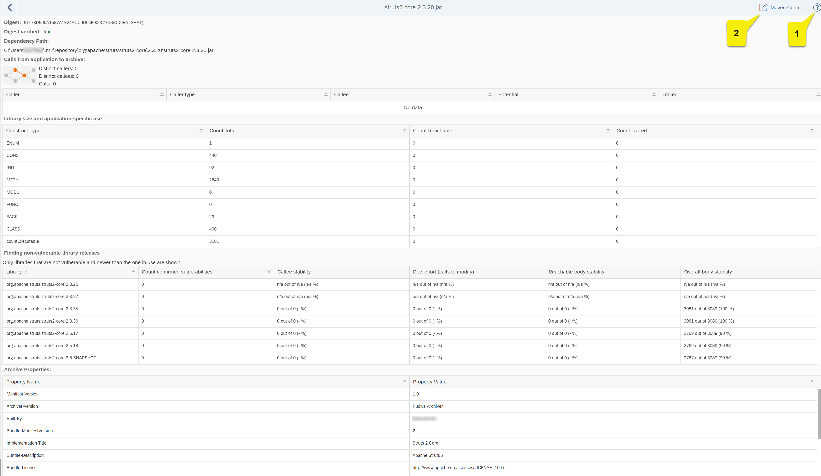 | 1 | Maven Central | Shows all versions of the given artifact in Maven Central Example: If the dependency shown is (commons-collections, commons-collections, 3.2.1), all versions of (commons-collections, commons-collections) known to Maven Central will be shown. |