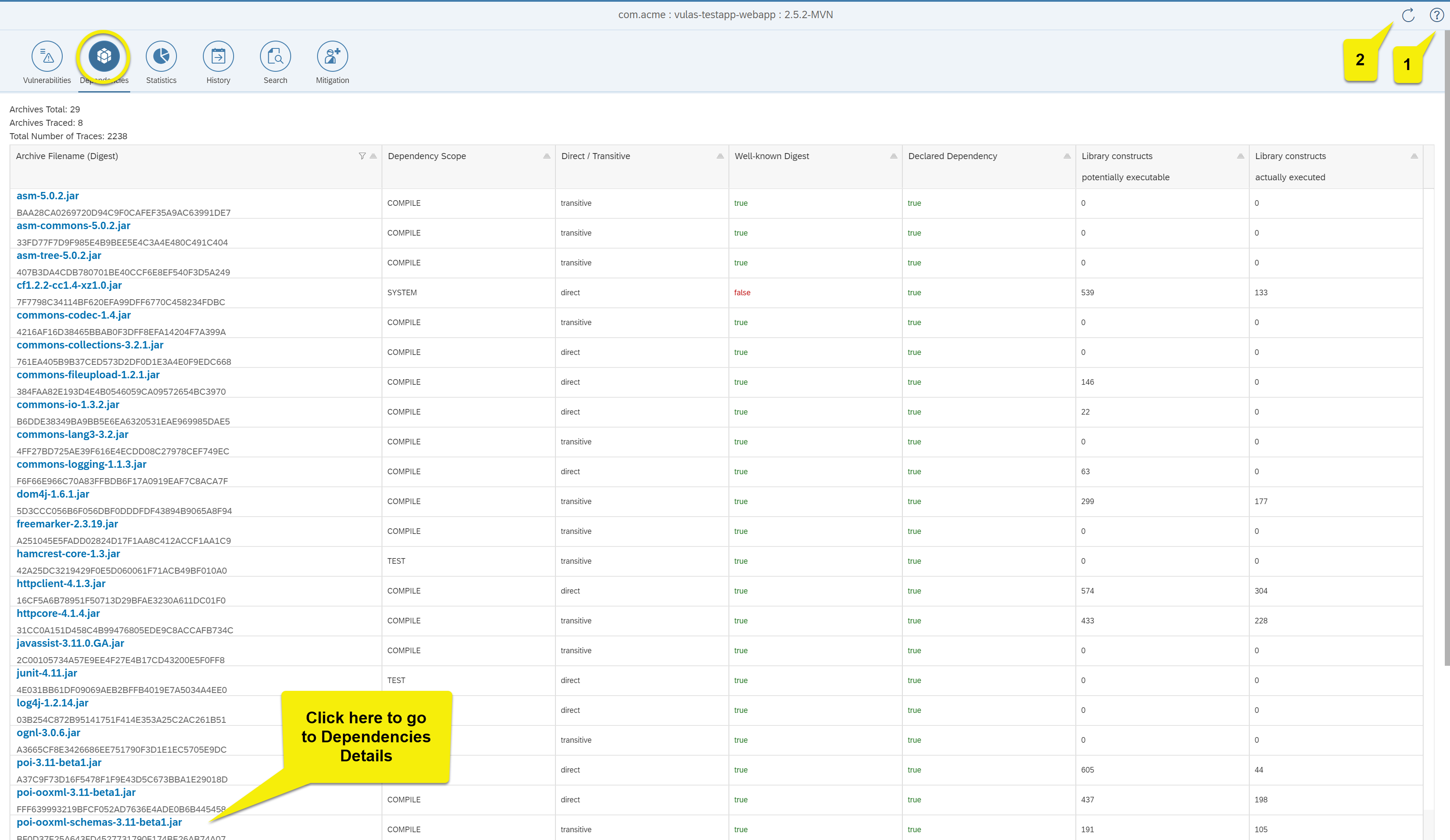 Data shown: All dependencies of the application. Click on a dependency's filename in order to open the dependencies details view