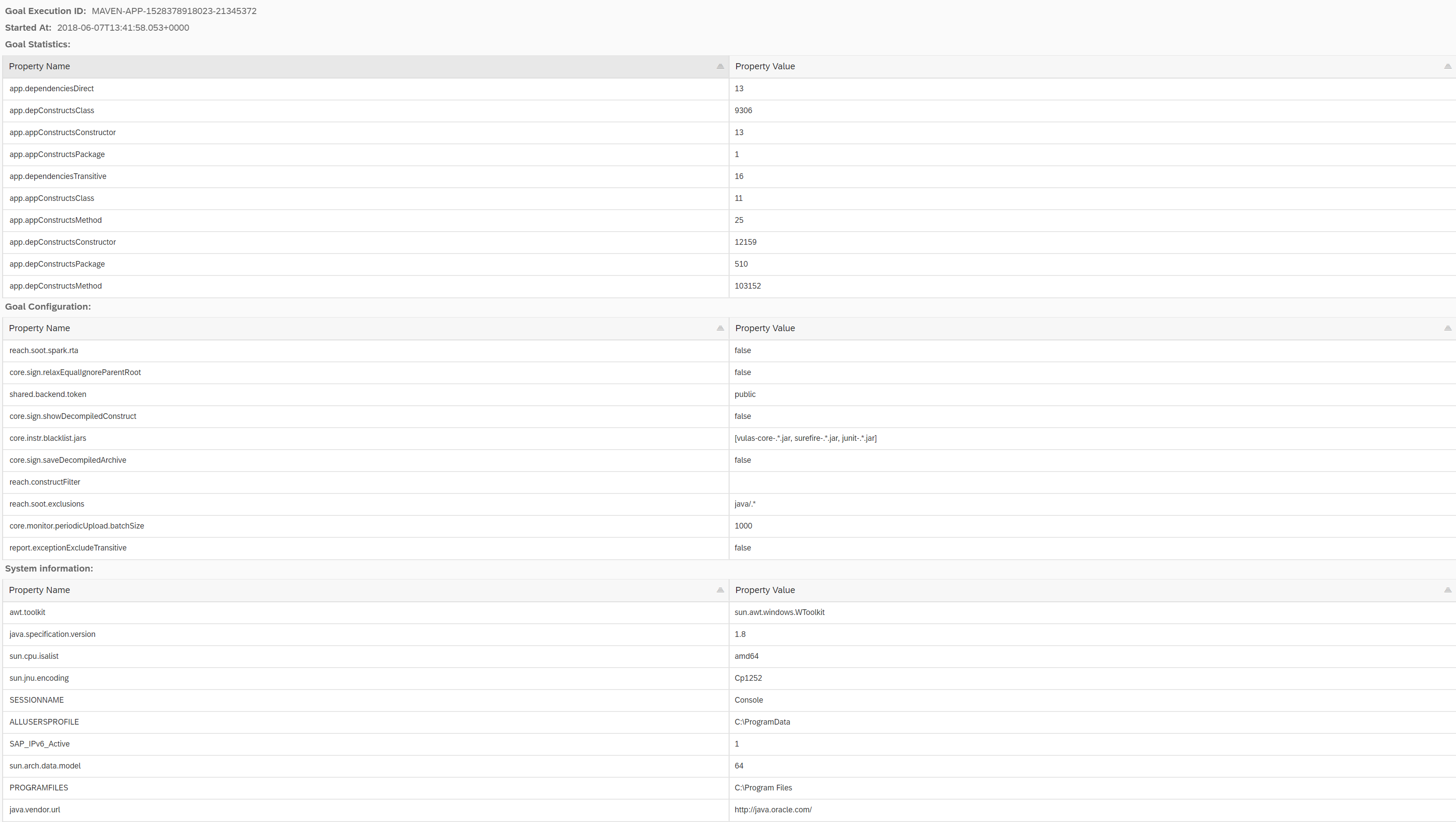Data shown: Java system properties and environment variables collected on the client during the goal execution. The configuration settings vulas.shared.sys and vulas.shared.env determine which information is collected: