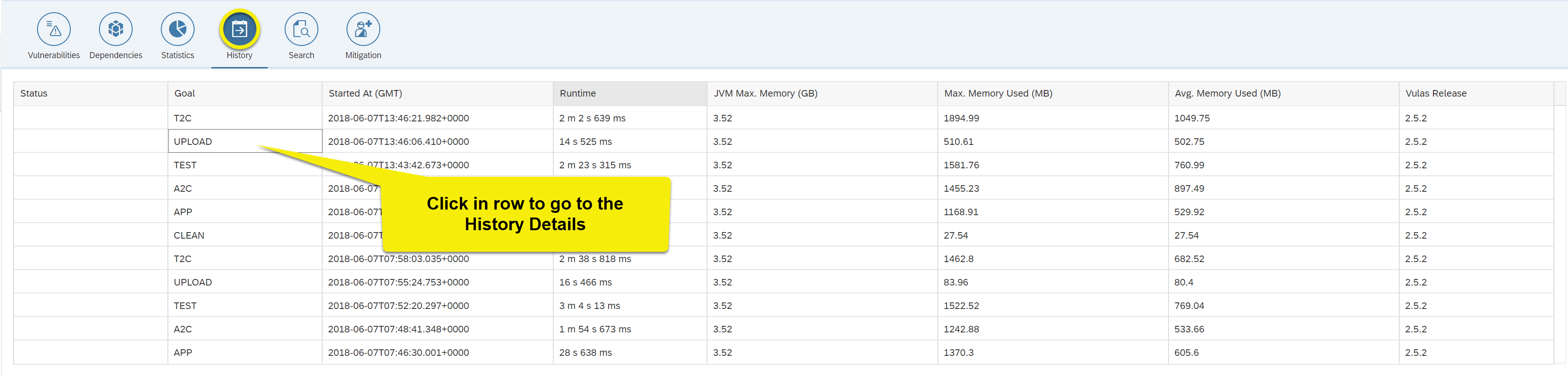 Data shown: Each row corresponds to one Eclipse Steady goal execution, click on a row in order to see detailed goal information.
