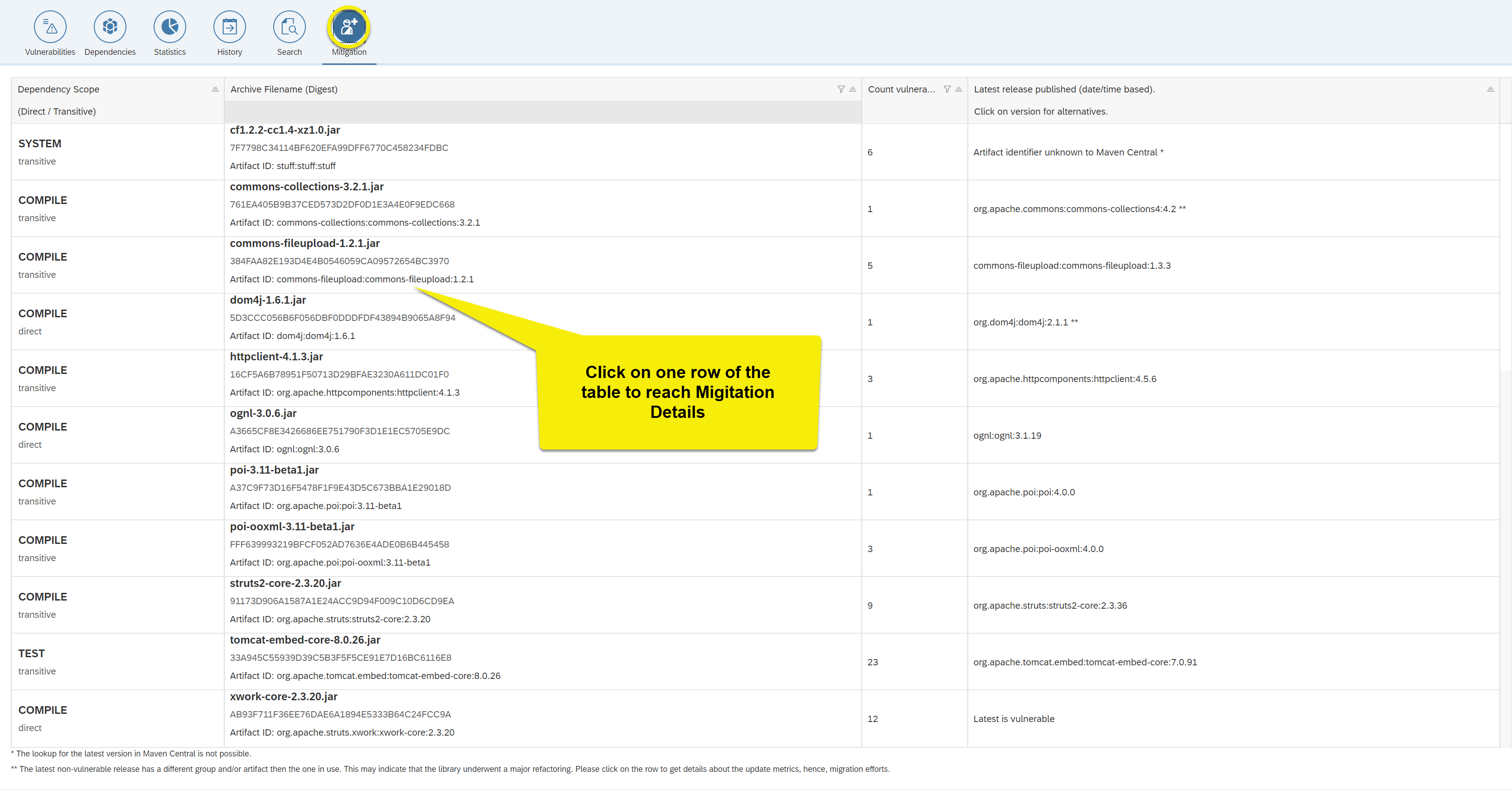 Data shown: Archives that have one or more known vulnerabilities, click on a row in order to see update proposals and metrics in the dependencies details view.