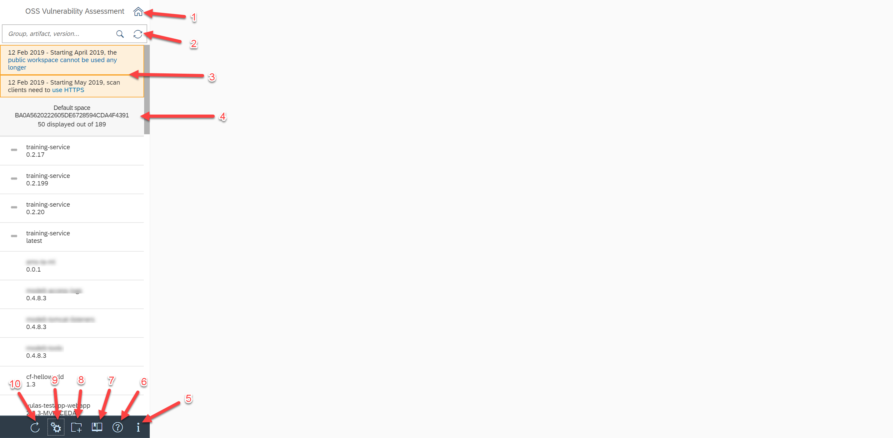| 3 | Toggle historical vulnerabilities | Shows and hides the display of historical vulnerabilities, e.g., vulnerabilities that existed in a previous version of the archive. Note: Historical vulnerabilities do not require any action as they do not represent a threat to application security. Note: This option is taken into account after pressing the "Reload Data" button (see 2) |