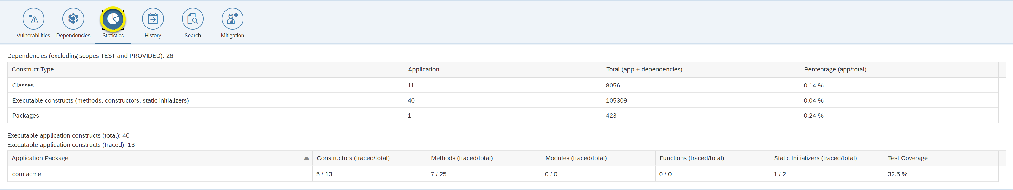 | Functions (traced/total) | Number of functions in the respective package that were traced during tests. Total number of functions in the respective package. Note: The application constructs are typically collected from the compiled application code, hence, also comprise synthetic functions such as access functions. |