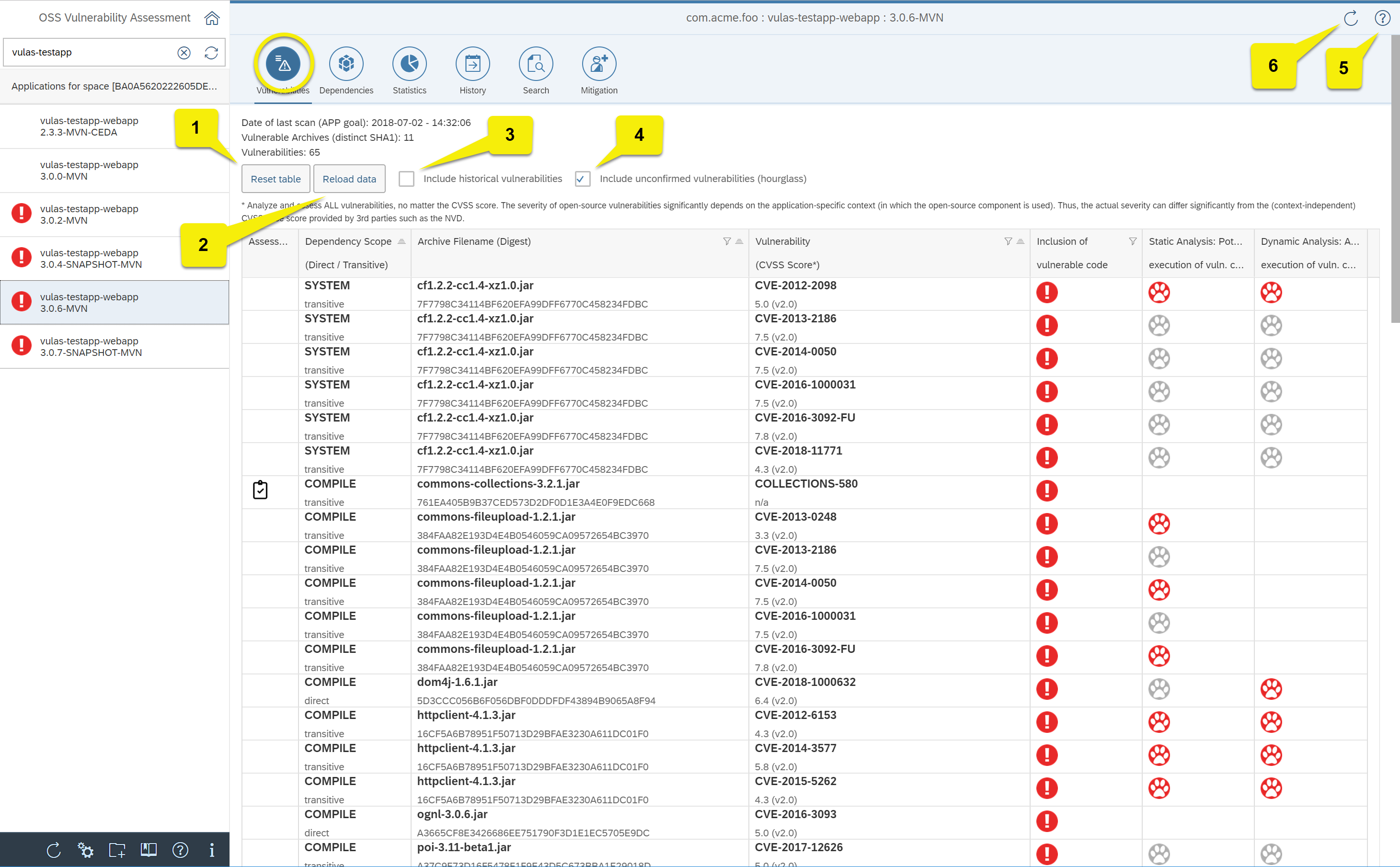 | 2 | Reload data | Reloads the app-specific analysis results from the database (use if you executed Eclipse Steady goals and want to see its analysis results in the frontend). |