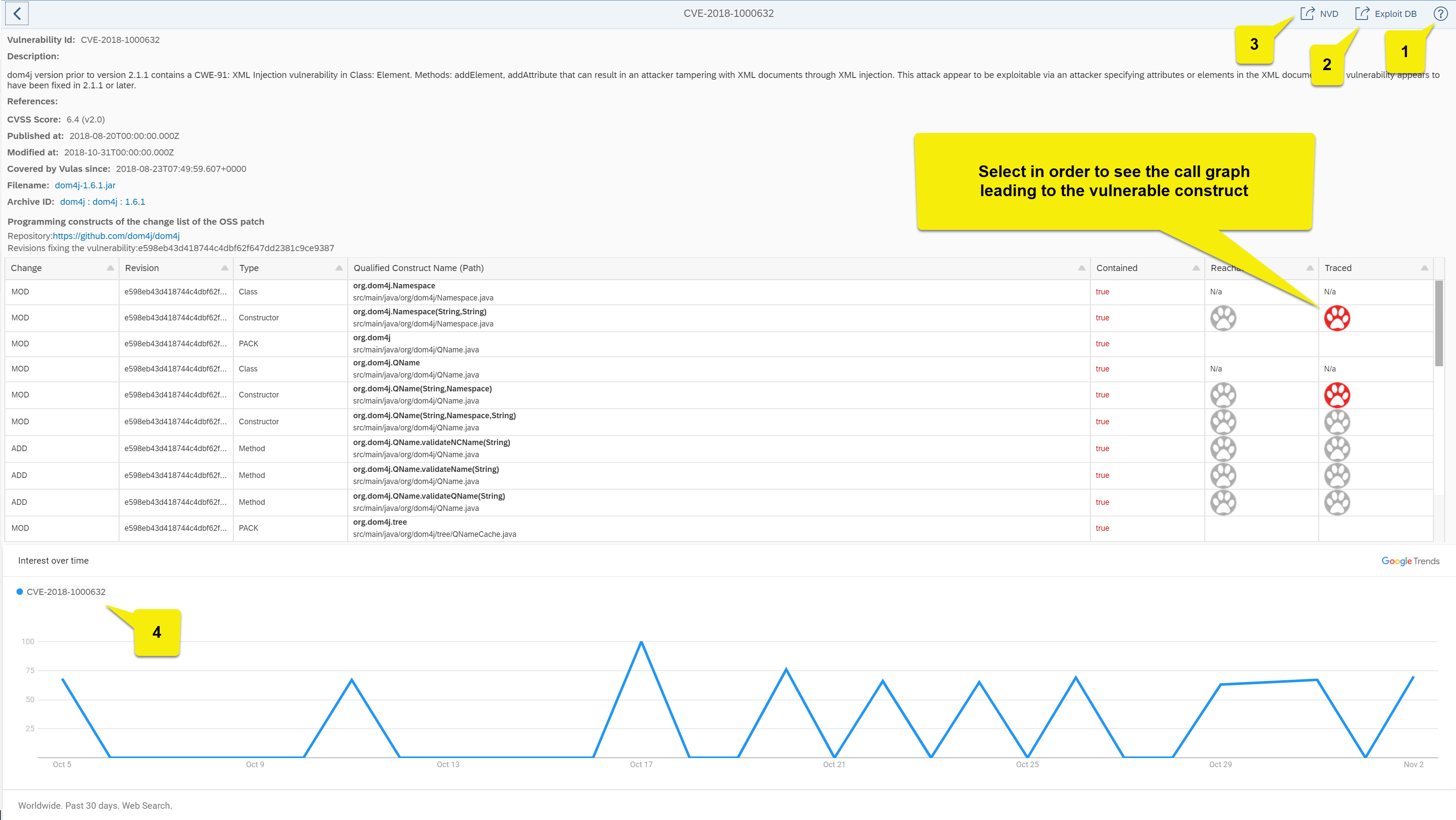 Objective of Page: Provide detailed information about the vulnerability, the source code repository of the Open-Source project and the constructs (e.g., methods) that have been touched by the Open-Source developers in order to fix the vulnerability.