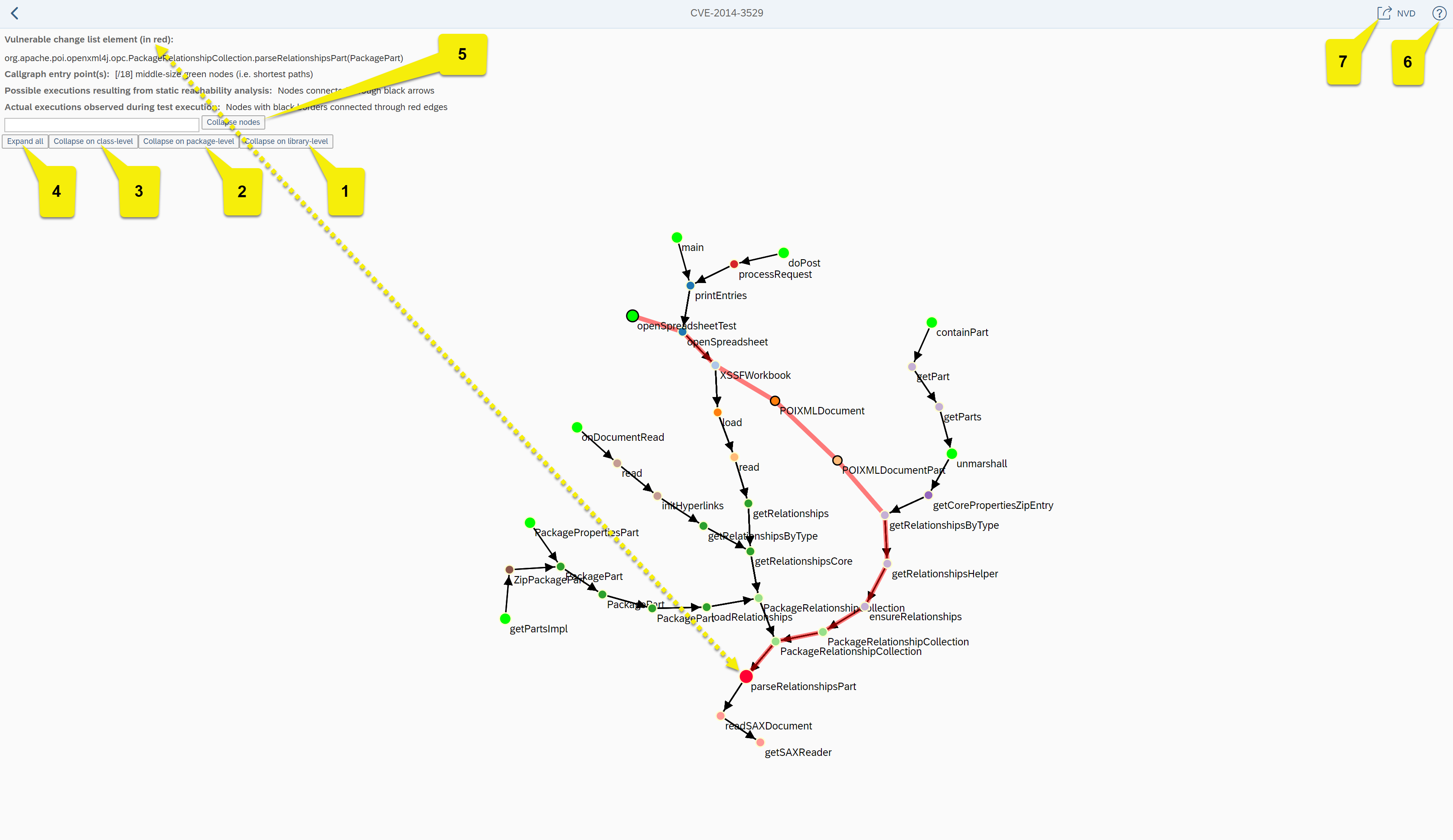 Data shown: The vulnerable methods are shown as red nodes, while methods part of the application are shown as green nodes. Black edges result from the static source code analysis, while red edges have been collected during test execution.The fully qualified name of methods and constructors as well as archive information is shown when hovering over nodes.